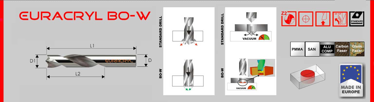Solid carbide drills in standard quality with protection against outflow cracking and protection against vacuum loss when using vacuum plates. For processing acrylic (PMMA), polycarbonate and other glossy or transparent plastics.