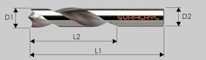 Solid carbide drills in standard quality with protection against outflow cracking and protection against vacuum loss when using vacuum plates. For processing acrylic (PMMA), polycarbonate and other glossy or transparent plastics.