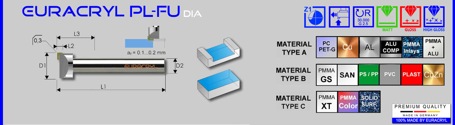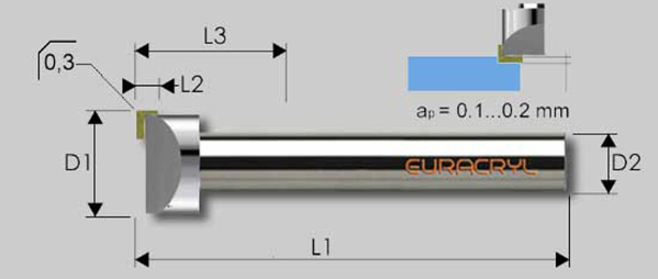 End mill with monocrystalline or polycrystalline diamond cutting edge for machining acrylic (PMMA), polycarbonate, and other glossy or transparent plastics, as well as non-ferrous metals. For processing horizontal surfaces (polishing bottoms). With auxiliary side cutting edge for small vertical surfaces, such as steps.