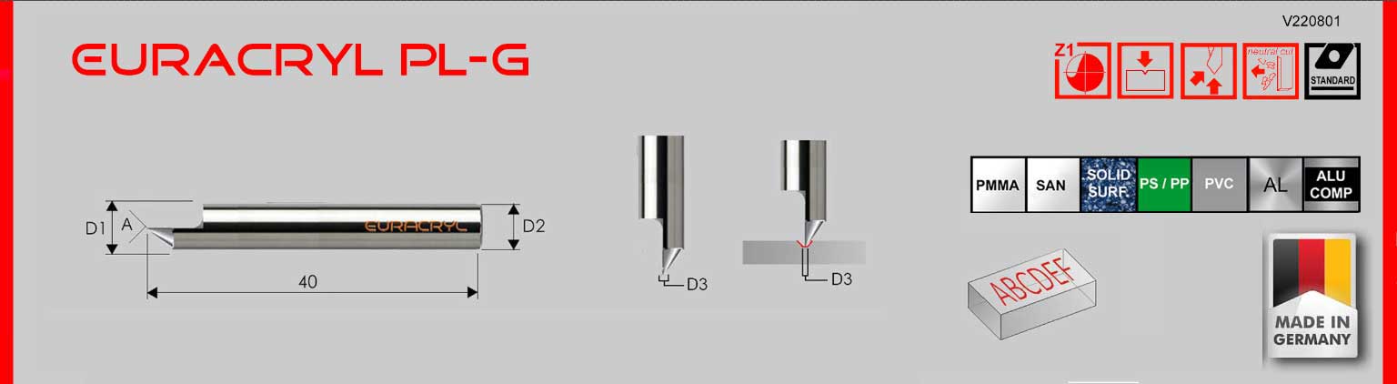 Solid carbide engraving tool. For matt engraving of acrylic (PMMA), polycarbonate and other glossy or transparent plastics as well as light metals. Straight cutting edge.
