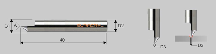 Solid carbide engraving tool. For matt engraving of acrylic (PMMA), polycarbonate and other glossy or transparent plastics as well as light metals. Straight cutting edge.