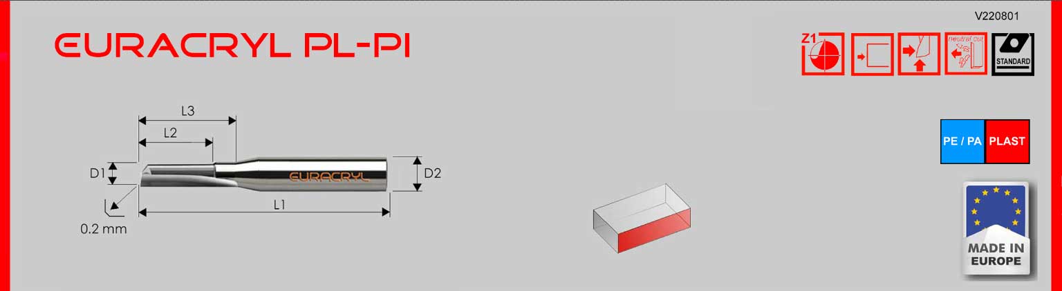 Solid carbide end mill in standard quality for processing acrylic (PMMA), polycarbonate and other glossy or transparent plastics as well as light metals. For processing vertical surfaces (vertical cut). Suitable as a roughing tool. Straight cutting edge