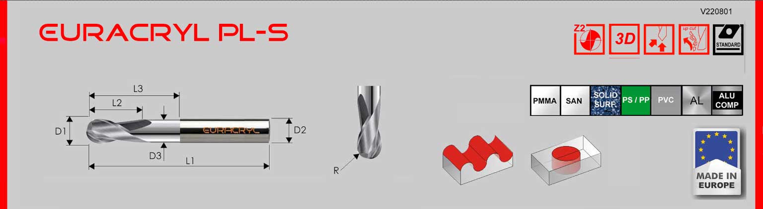 Solid carbide ball nose mills in standard quality. For 3-D machining or chamfering, deburring, centering, drilling, engraving, grooving, etc. For the processing of acrylic glass (PMMA), polycarbonate and other glossy or transparent plastics as well as light metals. Roughing tool. Right spiraled with chip removal upwards.