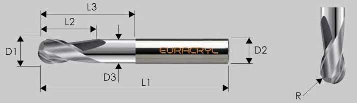 Solid carbide ball nose mills in standard quality. For 3-D machining or chamfering, deburring, centering, drilling, engraving, grooving, etc. For the processing of acrylic glass (PMMA), polycarbonate and other glossy or transparent plastics as well as light metals. Roughing tool. Right spiraled with chip removal upwards.