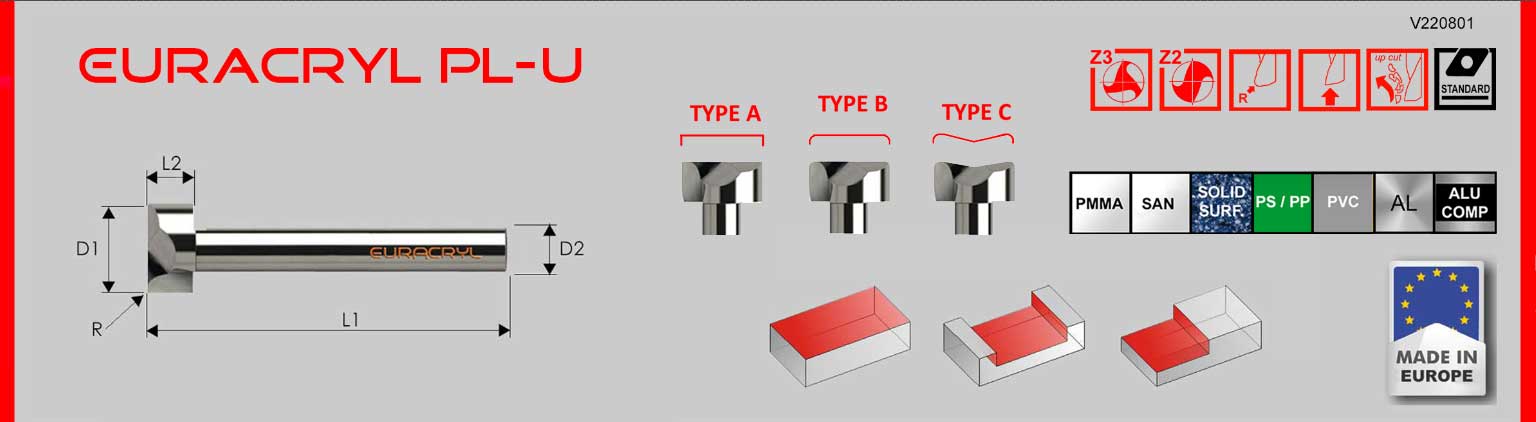 Solid carbide end mill in standard quality with or without rounded corners for processing acrylic (PMMA), polycarbonate and other glossy or transparent plastics as well as light metals. For the processing of horizontal surfaces. Suitable as a roughing tool. Right spiraled with chip removal upwards.