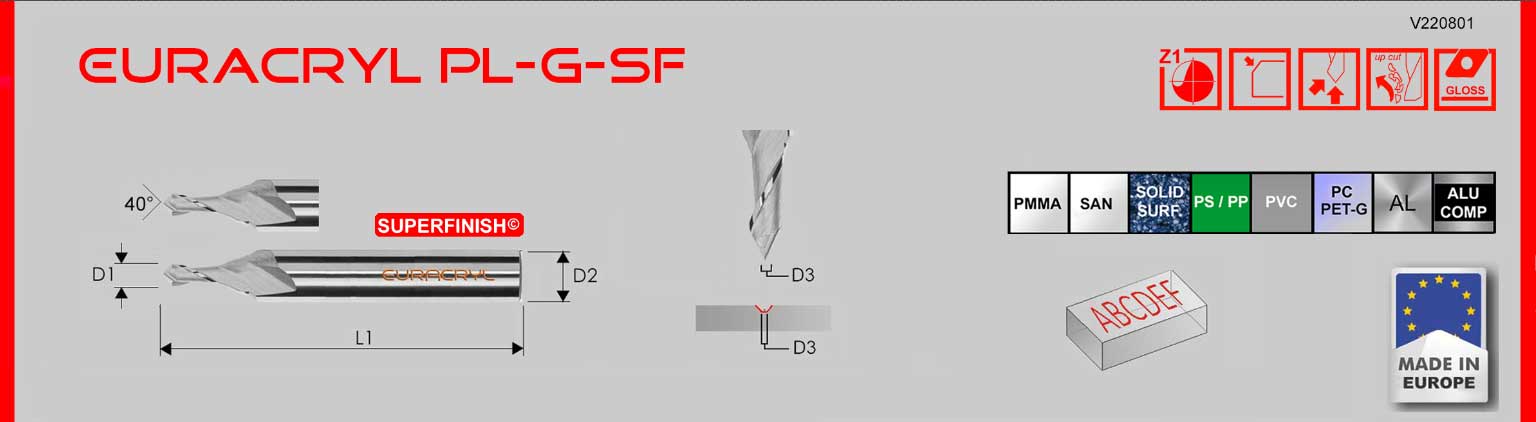 Solid carbide engraving tool. For translucid engraving of acrylic (PMMA), polycarbonate and other glossy or transparent plastics as well as light metals. Spiraled cutting edge.