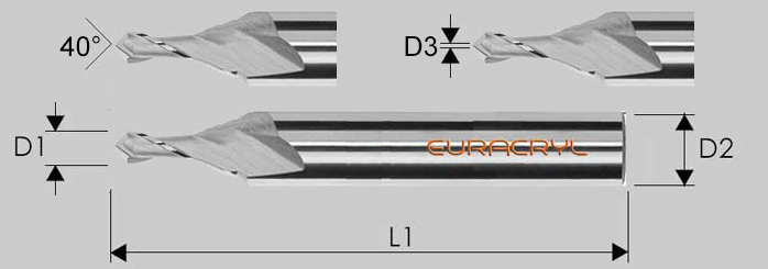 Solid carbide engraving tool. For translucid engraving of acrylic (PMMA), polycarbonate and other glossy or transparent plastics as well as light metals. Spiraled cutting edge.
