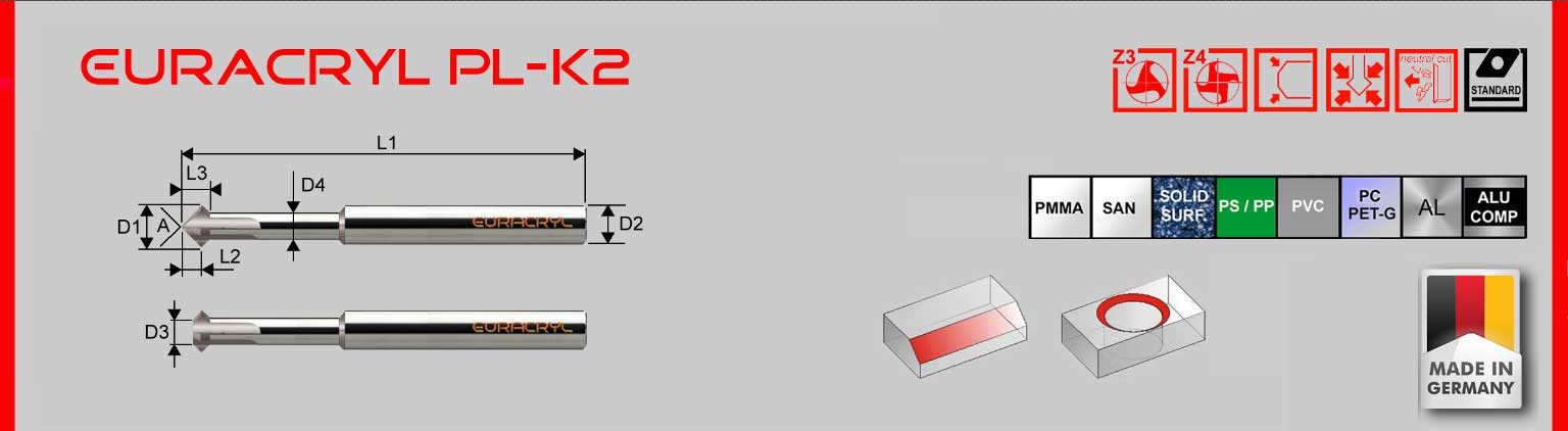 Forward and reverse deburrering tool. For processing acrylic (PMMA), polycarbonate and other plastics as well as light metals. Straight cutting edge.