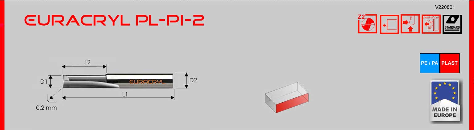 Solid carbide end mill in standard quality for processing PE and PA and other plastics. For processing vertical surfaces (vertical cut). Suitable as a roughing tool. 2 straight cutting edge.