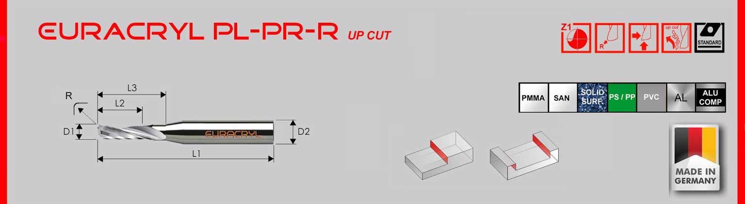 Solid carbide end mill with rounded corner in standard quality for the processing of acrylic (PMMA), polycarbonate and other glossy or transparent plastics as well as light metals. For processing vertical & horizontal surfaces (vertical/horizontal cut). Roughing and finishing tool. Right spiraled with chip removal upwards.