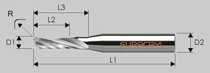 Solid carbide end mill with rounded corner in standard quality for the processing of acrylic (PMMA), polycarbonate and other glossy or transparent plastics as well as light metals. For processing vertical & horizontal surfaces (vertical/horizontal cut). Roughing and finishing tool. Right spiraled with chip removal upwards.