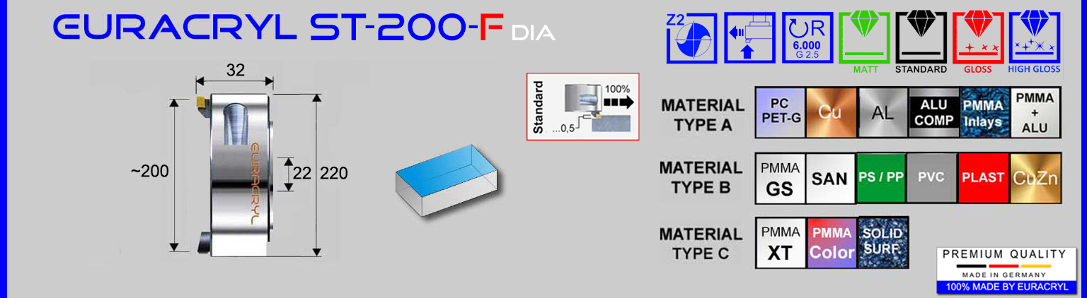 Face milling tool with fixed monocrystalline or polycrystalline diamond cutters for high gloss, standard gloss, satin surfaces, gluing surfaces, etc. For processing acrylic (PMMA), polycarbonate and other glossy or transparent plastics as well as mixed materials (PMMA + paper, PMMA + aluminum, Etc.) and non-ferrous metals. Application in cutter head holders.